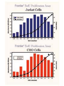 BrdU assay. Detection of variable numbers of Jurkat (non-adherent) or CHO cells